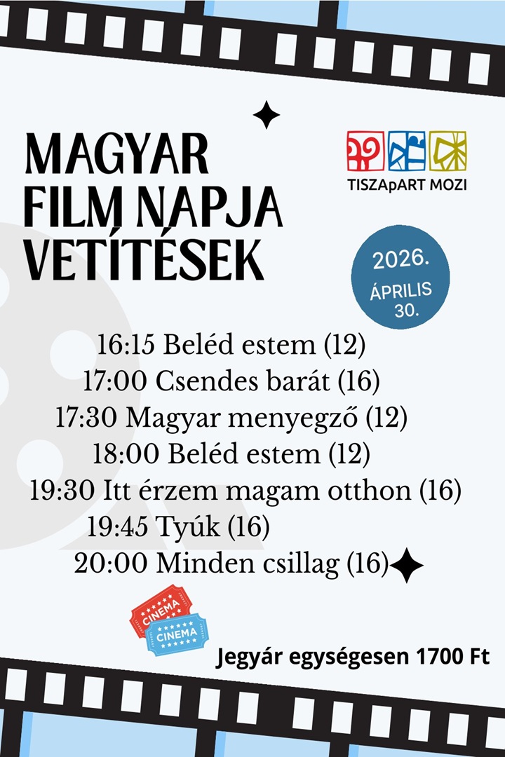 Szeretettel várunk mindenkit április 30-án, csütörtökön a Magyar Film Napja alkalmából vetített filmjeinkre!A jegyár egységesen 1700 Forint/fő.16:15 Beléd estem (12)17:00 Csendes barát (16)17:30 Magyar menyegző (12)18:00 Beléd estem (12)19:30 Itt érzem magam otthon (16)19:45 Tyúk (16)20:00 Minden csillag (16)
