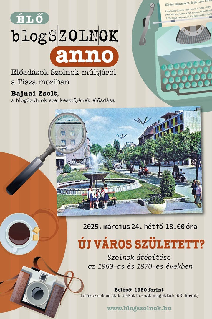Szolnok átépítése az 1960-as és 1970-es években Miután eldőlt, hogy a 4-es főút továbbra is Szolnok központján halad át, nemcsak új Tisza-hidat kapott a megyeszékhely, de elindult belváros teljes átépítése: egy új városközpont kialakítása, a Zagyván túli és a Zagyva-parti lakótelepek fejlesztése, no és persze az új vasútállomáshoz kapcsolódó beruházások sora. Akkoriban úgy gondolták, hogy Szolnoknak az ezredfordulóra 120 ezer lakója lesz. Talán ennek is köszönhető a Széchenyi lakótelep megszületése, új iskolák, óvodák, művelődési intézmények felépítése, de még a Tiszaliget gyorsütemű fejlesztése is. Az 1960-as évek elején született nagyszabású tervekből sok minden megvalósult és jó pár dolog félbe maradt, mire a nyolcvanas évek megtorpanása Szolnokon is beköszöntött. Bajnai Zsolt, a blogSzolnok szerkesztője korábbi Élő blogSzolnok ANNO előadásának – biztos, hogy nem pontos – ismétlése