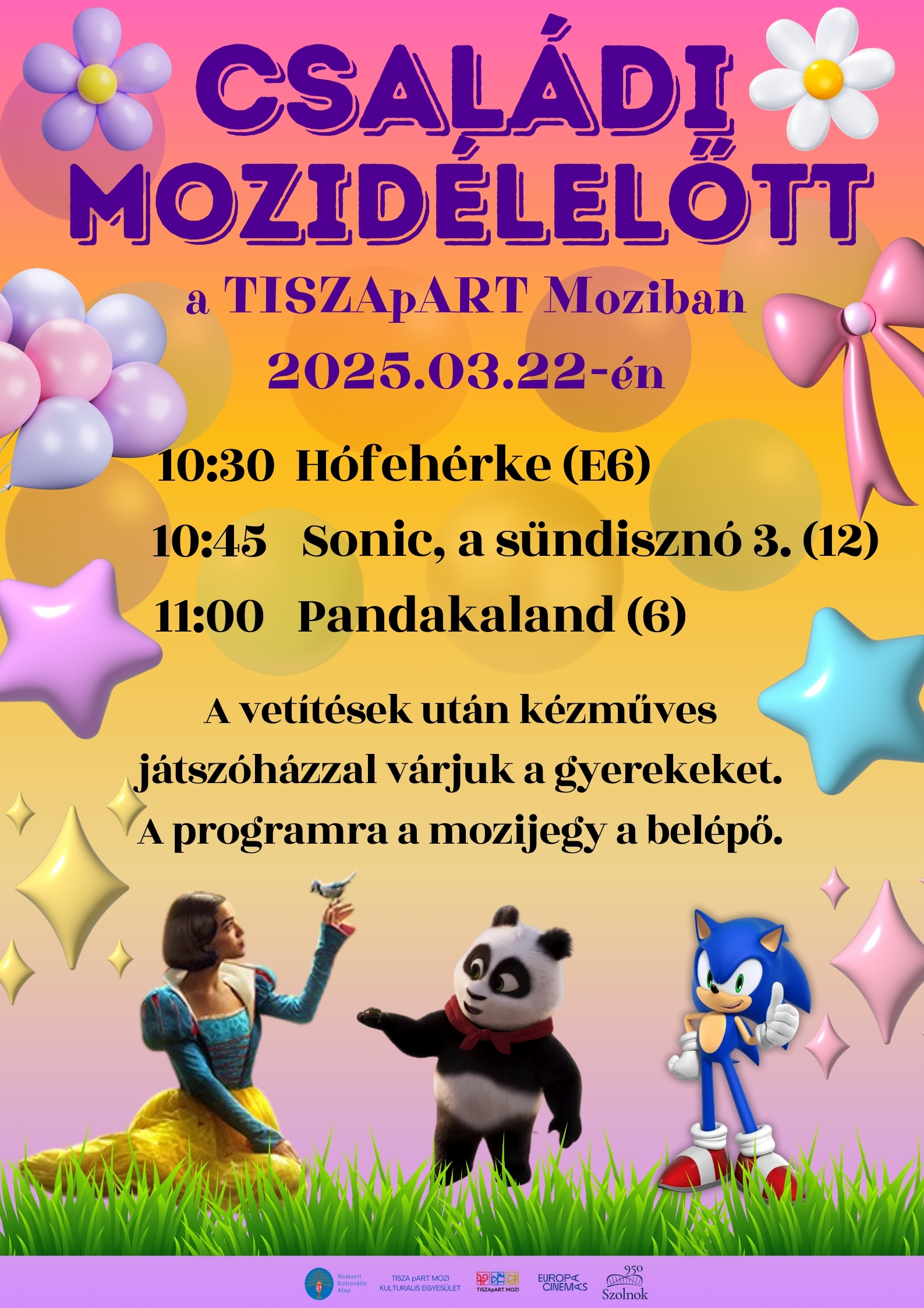 Családi Mozidélelőtt a TISZApART Moziban március 22-én, szombaton!Program:10:30 Hófehérke (E6)magyarul beszélő, amerikai-olasz-angol családi film 106’A Hófehérke a Disney 1937-es klasszikusának látványos, varázslatos újragondolása.JEGYVÁSÁRLÁS: https://www.tiszamozi.hu/jegyvasarlas?v=5756410:45 Sonic, a sündisznó 3. (12)magyarul beszélő, amerikai-japán akciófilm, kalandfilm, vígjáték, 104’Sonic, Knuckles és Tails összefognak egy veszélyes új ellenféllel, Shadow-val szemben, aki egy rejtélyes gonosztevő, és olyan ereje van, amilyennel még egyiküknek sem volt dolga. És mivel a Sonic csapat képességeit ez a kihívás minden szempontból meghaladja, keresniük kell egy váratlan szövetségest, hogy megállítsák Shadow-t, és megvédjék a bolygót.JEGYVÁSÁRLÁS: https://www.tiszamozi.hu/jegyvasarlas?v=5756511:00 Pandakaland (6)magyarul beszélő dán-holland-francia-német-észt animációs film, 89'Pang, a vidám és kalandvágyó ifjú panda Kínából Afrikába utazik, hogy megmentse legjobb barátját, Jielongot, az elrabolt sárkányt. Útja során egy számára teljesen ismeretlen világ tárul fel előtte félelmetes vízilovakkal, kétes szándékú hiénákkal és bölcs gorillákkal. Az eszére – és néhány újonnan szerzett barátjára – hagyatkozva nemcsak Jielongra sikerül rátalálnia, de új barátainak otthonát is megmenti.JEGYVÁSÁRLÁS: https://www.tiszamozi.hu/jegyvasarlas?v=5756310:00 órától az Aranyos Szeglet Waldorf Iskola és Óvoda tanulói zenés műsorral várják az érdeklődőket.A vetítések után kézműves játszóházzal várunk!A programra a mozijegy a belépő.