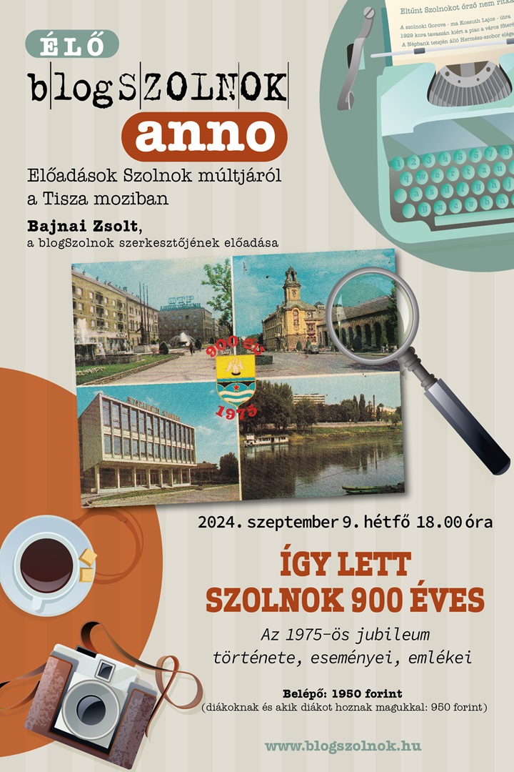 Az 1975-ös jubileum története, eseményei, emlékei Nem Szolnok volt az egyetlen város, amelyik a Kádár-kor idején fedezte fel sok évszázados gyökereit, így a hatvanas-hetvenes években a „felszabadulás” vagy a Tanácsköztársaság évfordulói helyett más, nagyobb évszámmal jelölhető, történelmi gyökereket felmutató megemlékezéseket lehetett rendezni. Szolnok a hetvenes évek elejétől készült a város első, ismert írásos említésének 900. évfordulójához kapcsolódó jubileumra. A 900 éves Szolnok ünnepségsorozat azonban nem csak 1975-ről szólt, nem csupán jelentős beruházások átadását foglalta magában, hanem rengeteg esemény, különleges rendezvény is kapcsolódott hozzá, sőt emléktárgyak sora is készült az alkalomra. És nem feledkezhetünk meg arról sem, hogy az akkori szolnokiak sok mindent társadalmi munkában, ingyen vagy a két kezük munkájával hoztak létre. Bajnai Zsolt, a blogSzolnok.hu szerkesztőjének képes előadása
