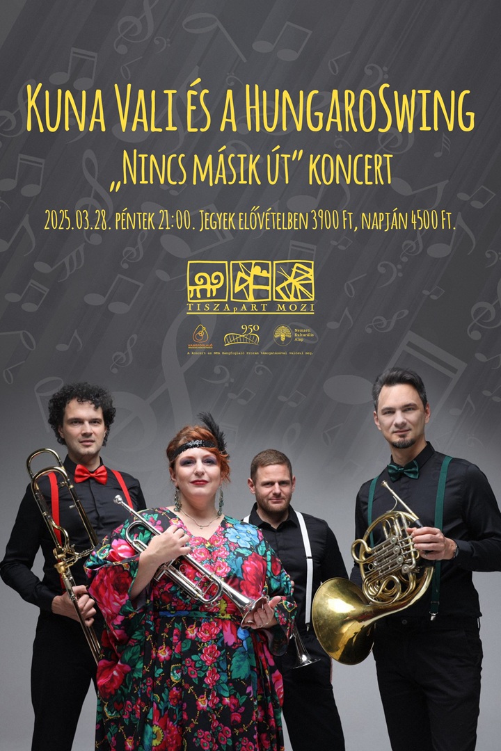 A DAL 2025 zenei verseny résztvevője, Kuna Vali és a HungaroSwing koncertje a TISZApART Moziban. Alapítótagjai a Kuna testvérek, akik 32 éves múltra tekintenek vissza, Príma-díjas zenészek. A XX. század eleji jazz eleganciája és a modern tánczene frissessége ötvöződik műsorukban, balkáni réz-motívumok színesítésével, egy igazi vérpezsdítő elegyet alkotva. “Nincs másik út” című dalukat sok száz beadott alkotás közül beválogatták A DAL 2025 legjobb harminckét dala közé, mely a koncerten is elhangzik majd.