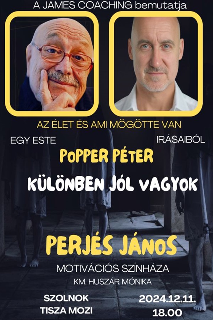 Különben jól vagyok - este POPPER PÉTER írásaiból / Perjés János motivációs színháza2024. december 11-én 18:00 órátólMesék empátiáról és tapintatról, durvaságról, szeméremről és intimitásról, szakításról és újrakezdésről, férfi- és női szerepekről, hűtlenségről és illúziókról.Különben jól vagyok...vagy mégsem?Popper Péter anyagaiból motivációs estet adni fantasztikus érzés. A motivációs estek sokszor könnyű sikert ígérnek, és felbolygatják a Benned lévő elnyomott érzéseket.Popper Péter azonban az emberi lélek mindentudója volt.Ha ismerte az ellenszert, a gyógyírt, ha tudott valami titkos praktikát, akkor elárulta. Ha nem, akkor minden szépítgetés és kincstári optimizmus nélkül bevallotta: nem hisz abban, hogy az élet minden problémájára létezik megoldás. Vannak olyan helyzetek is, amelyeket csak elviselni lehet, jól vagy rosszul. A tanítás azonban sohasem felesleges, hiszen információk és megoldások mellett vigasztalást is nyújt, segít újragondolni és átértékelni dolgokat, erre pedig valamennyiünknek szükségünk lehet.Az elgondolkodtató, szórakoztató fejezetek hétköznapi életünk egy-egy fontos témájára épülnek, ilyen például a félelem, a szorongás, a depresszió, az egyéni és kollektív hazugságok, a játszmák, a családi és párkapcsolati konfliktusok, krízisek. Ezek az élet nagy kérdései és problémái, melyek alaposan meg tudják gyötörni, sebezni az emberi lelket. Ezeket nevezte ő lélekrágcsálóknak. Hogyan védekezhetünk a lélekrágcsálók ellen, és miként gyógyíthatjuk be az általuk ejtett sebeket?Mesék empátiáról és tapintatról, durvaságról, szeméremről és intimitásról, szakításról és újrakezdésről, férfi- és női szerepekről, hűtlenségről és illúziókról.Az est különlegességeként színészként színpadi hősök példáin keresztül mutatom meg Popper Péter igazságát és megismerkedhetnek saját verseivel."Közreműködik: Huszár MónikaJegyvásárlás személyesen a Tisza Mozi pénztárában és online: https://www.jegy.hu/program/kulonben-jol-vagyok-este-popper-peter-irasaibol-perjes-janos-motivacios-szinhaza-163012