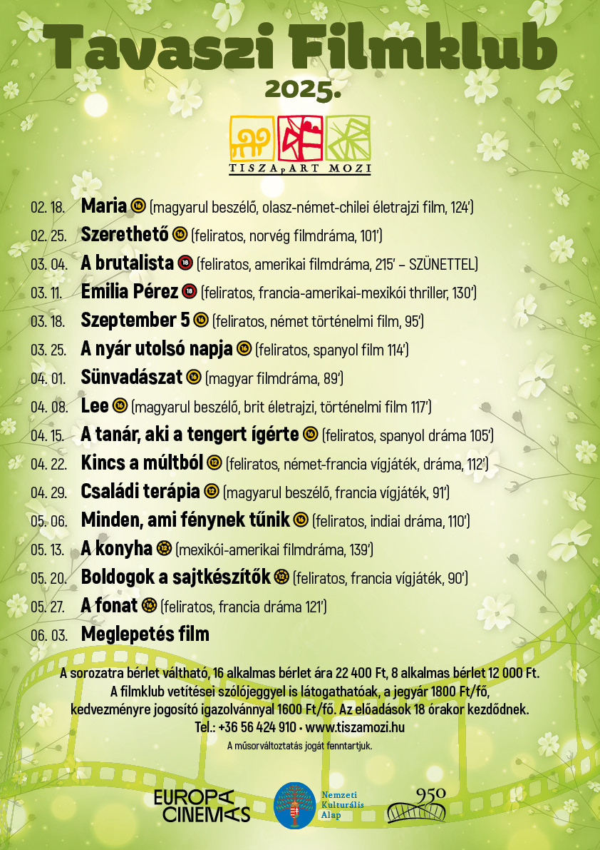 TAVASZI FILMKLUB 2025Február18. Maria (16) (magyarul beszélő, olasz-német-chilei életrajzi film, 124’)25. Szerethető (16) (feliratos, norvég filmdráma, 101’)Március04. A brutalista (18) (feliratos, amerikai filmdráma, 215’ – SZÜNETTEL)11. Emilia Perez (18) (feliratos, francia-amerikai-mexikói thriller, 130’)18. Szeptember 5 (16) (feliratos, német történelmi film, 95’)25. A nyár utolsó napja (16) (feliratos, spanyol film 114’)Április01. Sünvadászat (16) (magyar filmdráma, 89’)08. Lee (16) (magyarul beszélő, brit életrajzi, történelmi film 117’)15. A tanár, aki a tengert ígérte (16) (feliratos, spanyol dráma 105’)22. Kincs a múltból (12) (feliratos, német-francia vígjáték, dráma, 112’)29. Családi terápia (12) (magyarul beszélő, francia vígjáték, 91’)Május06. Minden, ami fénynek tűnik (16) (feliratos, indiai dráma, 110’)13. A konyha (E12) (mexikói-amerikai filmdráma, 139’)20. Boldogok a sajtkészítők (E12) (feliratos, francia vígjáték, 90’)27. A fonat (E16) (feliratos, francia dráma 121’)Június03. Meglepetés filmA sorozatra bérlet váltható: 16 alkalmas bérlet ára 22400 Ft, 8 alkalmas bérlet ára 12000 Ft.A filmklub vetítései szólójeggyel is látogathatóak, a jegyár 1800 Ft/fő, kedvezményre jogosító igazolvánnyal 1600 Ft/fő. Az előadások 18:00 órakor kezdődnek.A műsorváltoztatás jogát fenntartjuk!Bérletvásárlás az előző évadban bérlettel rendelkező nézőink számára 2025. február 03-tól.Nyilvános bérletvásárlás 2025. februrár 12-től.