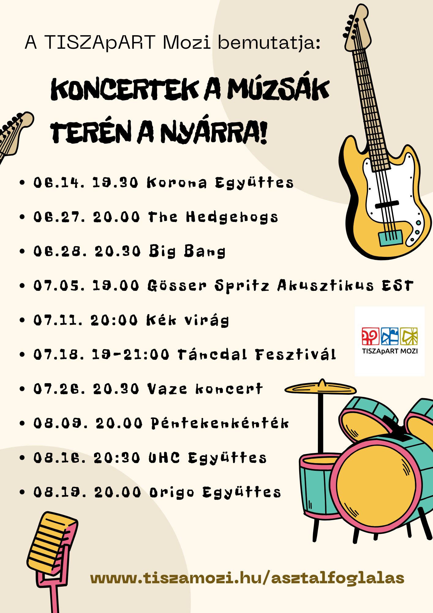 Koncertek a Múzsák terén a TISZApART Mozi szervezésében 2025. június 16. - augusztus 19-ig.A részvétel ingyenes, de asztalfoglaláshoz kötött: www.tiszamozi.hu/asztalfoglalas