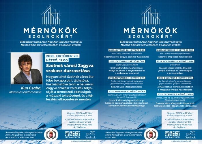 A Mérnökök Szolnokért előadássorozat első vendége, Kun Csaba, okleveles építőmérnök. A Szolnok városi Zagyva-szakasz duzzasztása című előadásában arról beszél, hogy hogyan lehet a Szolnok életébe bekapcsolni, láthatóvá, használhatóvá tenni a belvárosi szakasz zöld-kék folyosóját a természeti adottságok, a műszaki lehetőségek és a fejlesztési elképzelések mentén.A részvétel ingyenes, de regisztrációhoz kötött.