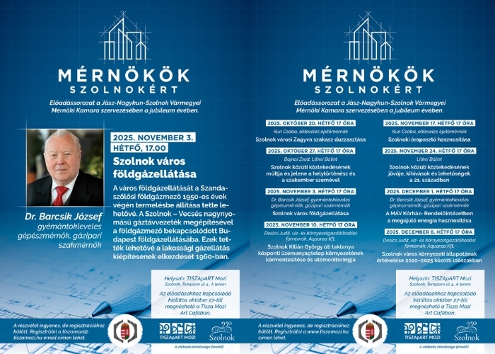 A Mérnökök Szolnokért előadássorozat harmadik felvonásának vendége dr. Barcsik József, gyémántokleveles gépészmérnök.A város földgázellátását a szandaszőlősi földgázmező 1950-es évek végén termelésbe állítása tette lehetővé. A Szolnok-Vecsés nagynyomású gáztávvezeték megépítésével a földgázmező bekapcsolódott Budapest földgázellátásába. Ezek tették lehetővé a lakossági gázellátás kiépítésének elkezdését 1960-ban.A részvétel ingyenes, de regisztrációhoz kötött.