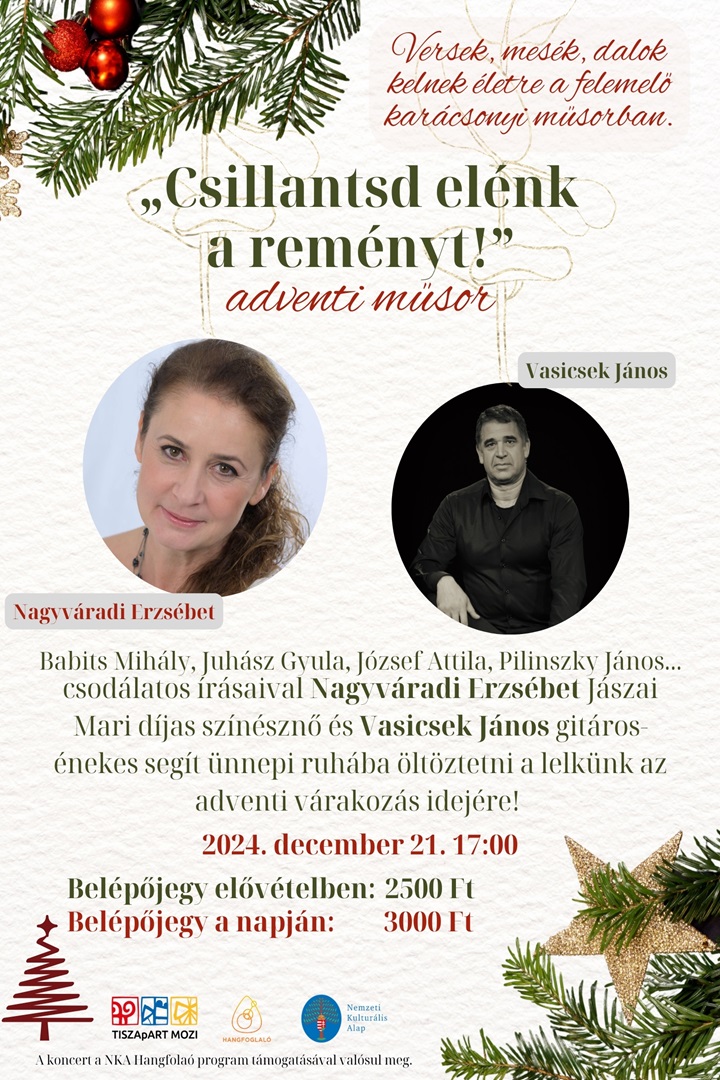 "Csillantsd elénk a reményt!" ádventi műsor Megható, lélekemelő műsor az ádventi ünnepre, a várakozás idejére! Az előadás hossza 1 óra. Jézus születésére Lukács evangéliumának segítségével emlékezünk, majd a legnagyobb magyar írók és költők: Babits Mihály, Juhász Gyula, Móra Ferenc, Fekete István, Szabó Lőrinc, stb... tollából versek, mesék kelnek életre a Jászai Mari-díjas Nagyváradi Erzsébet érzelemdús tolmácsolásában. A versek, novellák között közismert dalok és megzenésített versek előadásával idézi meg a karácsonyi hangulatot Vasicsek János gitáros-énekes. A szívmelengető műsor ünnepi ruhába öltözti lelkünket a Megváltó eljövetelére.