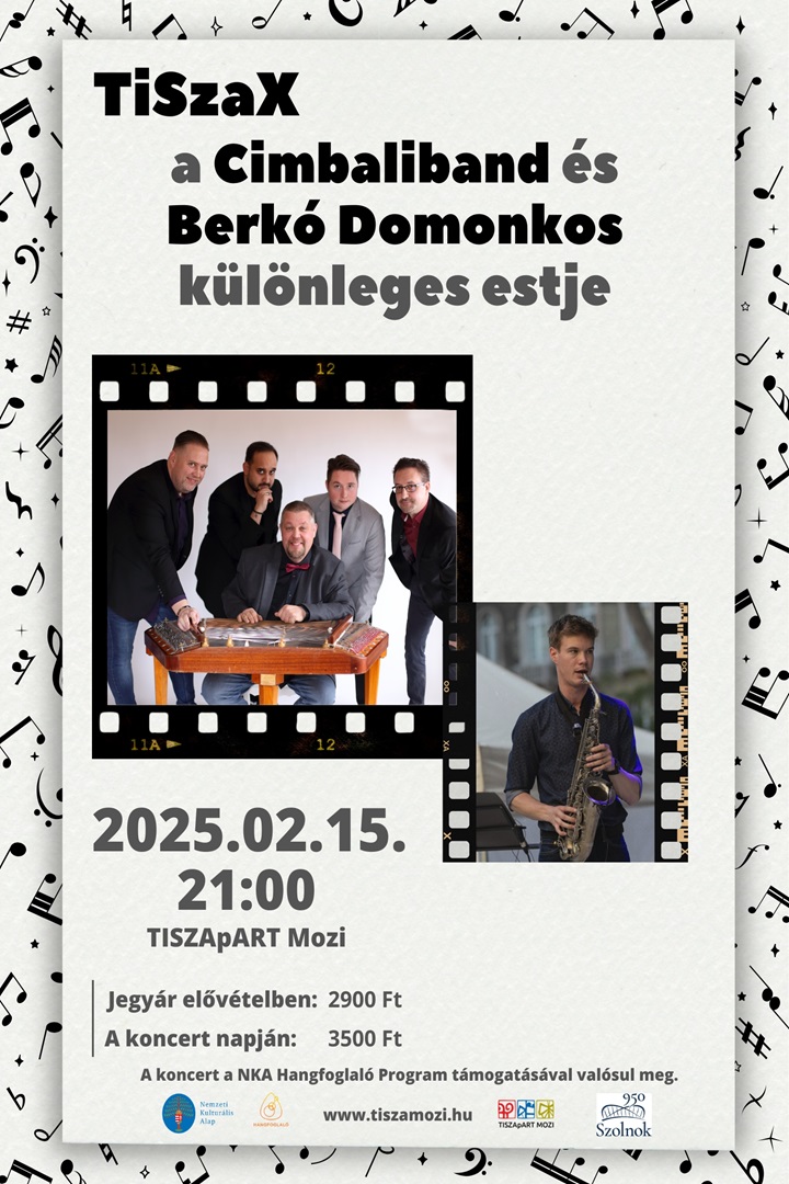 Immár hagyomány, hogy februárban a szolnoki Tisza moziban koncertezik a Fonogram- és Pest Vármegye Kultúráért díjas Cimbaliband, Unger Balázs Magyar Köztársasági Ezüst Érdemkereszttel kitüntetett cimbalom művész vezetésével. Ezúttal Berkó Domonkos, a Pinkers és a Benkó Dixieland Band szaxofonosa és klarinétosa csatlakozik vendégként, aki már a Hot Jazz Bandben és a Cimbaliband koncertjein is bizonyított. Ezen az estén számos új dal hangzik el először, köztük több ősbemutató, melyek a zenekar és Domonkos közös munkájának gyümölcsei. Egy exkluzív élmény, amit a szolnoki közönség hallhat először!