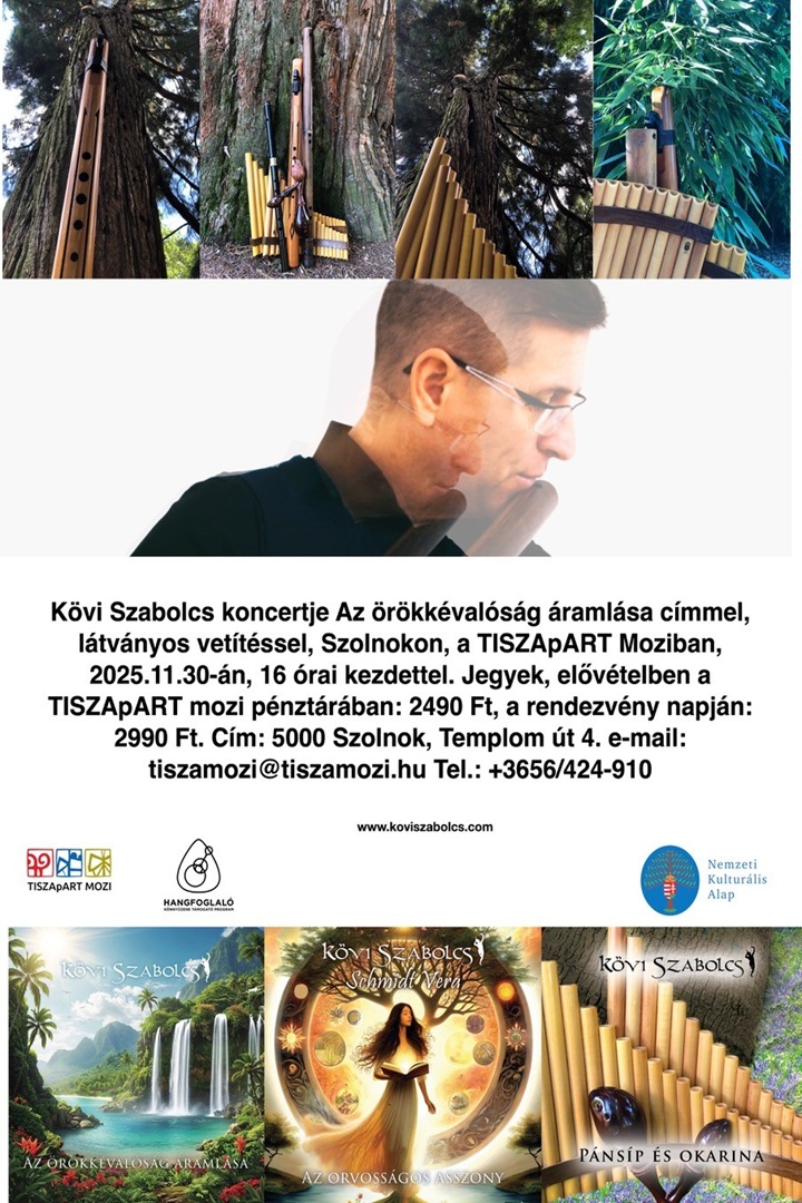 Kövi Szabolcs koncertje: Az örökkévaló áramlása címmel látványos vetítéssel a TISZApART Moziban 2025. november 30-án 16:00 órától. "Kövi Szabolcs vagyok, saját magam készítem a meditatív és relaxációs hangulatú albumaimat. Hallgatóim 30 év alatt számos visszajelzést adtak, így állíthatom, hogy a CD lemezek alkalmasak meditáció, relaxáció közben, zeneterápiás célú használatra, lehet velük gyerekeket és felnőtteket altatni, nyugtatni, alkalmas háttérzeneként alkotótevékenységhez, tanuláshoz, jógához, lazító gyakorlatokhoz."