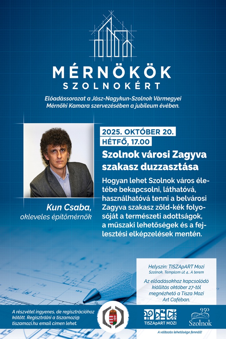 Mérnökök Szolnokért előadássorozat a Jász- Nagykun-Szolnok Vármegyei Mérnöki Kamara szervezésében a jubileum évében. Hogyan lehet Szolnok város életébe bekapcsolni, láthatóvá, használhatóvá tenni a belvárosi Zagyva szakasz zöld-kék folyosóját a természeti adottságok, a műszaki lehetőségek és a fejlesztési elképzelések mentén. Előadó: Kun Csaba okleveles építőmérnök