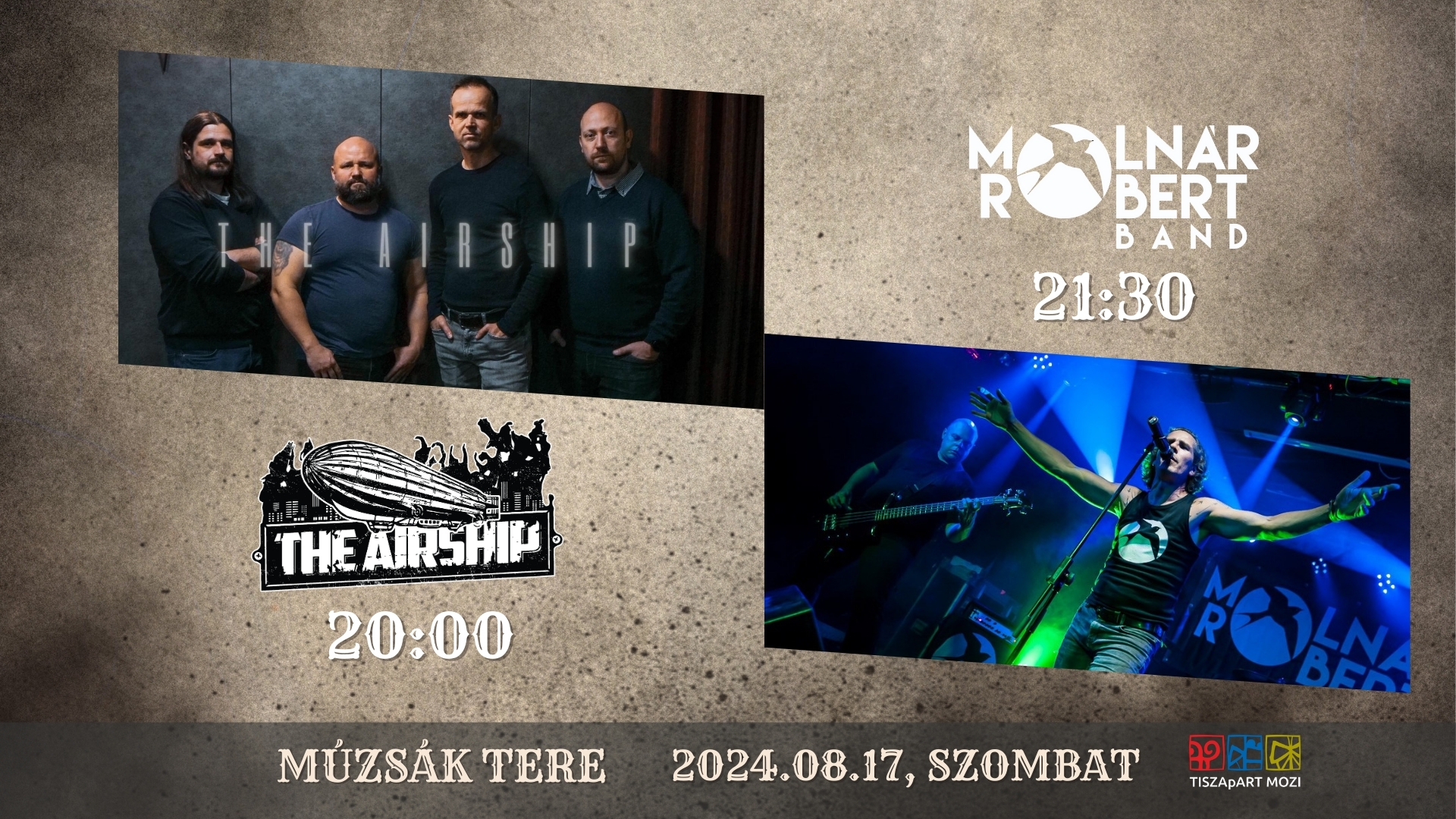 20:00The AirshipA The Airship 2018- ban alakult Szolnokon, klasszikus dob-gitár-basszusgitár-ének felállásban.Könnyed blues-rockzenét játszik, szájharmonika kisérettel, dallamos gitárszólókkal ,angol nyelvű dalszövegekkel. Első lemezük 2020-ban jelent meg, amit azóta 2 másik kislemez követett.Legutóbbi videóklipjüket a TISZApART Moziban forgatták: https://www.youtube.com/watch?v=m2AQkARuxRUA zenekar tagjai:Munkácsi Péter – gitárFarkas András - ének, szájharmonikaSüle Dávid – dobokMihályi Ádám – basszusgitár21:30 Molnár Róbert BandA Molnár Róbert Band a hazai dark- rock műfaj egyik legismertebb arcának csapata. Robi több mint 10 évig az Árnyak frontembere volt, hat album, több száz koncert, két német és francia turné, rengeteg fesztivál fellépés, számos videoklip maradt utánuk. Aztán Robi megalakította a hasonló műfajban utazó Octobert, kiváló kritikákat kapott az összes album, számtalan erdélyi turné, fesztivál fellépés, hazai koncert jellemezte a csapatot. 2016- ban saját néven alapított bandát, melyben ugyan az a Papp István a gitáros, aki az Árnyak gitáros- zeneszerzője volt. Nem csoda, hogy az új dalok bármelyik Árnyak albumra felférnének. A duó egy kiváló ritmus szekcióval egészül ki. Az új dalok mellett a Molnár Róbert Band a főhős mindkét előző csapatától játszik dalokat, a koncertek gerincét Árnyak nóták adják, ezek mellett October dalok is előkerülnek. Eddig 6 klipjüket láthattuk, tavaly megjelent új lemezük, az „Üvegfal”, melyet a rockzenei weboldalak az év egyik legjobb idei hazai lemeznek tartanak. Idén pedig új kislemezzel jelentkeztek, rajta a Junkies zenekar Maszk című dalának feldolgozásával, mely osztatlan sikert aratott.Molnár Róbert – énekPapp István – gitár, vokálVarró Gábor – basszusgitárPogány Gábor - dobA rendezvény ingyenes, de asztalfoglaláshoz kötött. A helyszínen kizárólag az ART Caféban vásárolt termékek fogyaszthatóak.A szervezők a műsorváltozás jogát fenntartják.