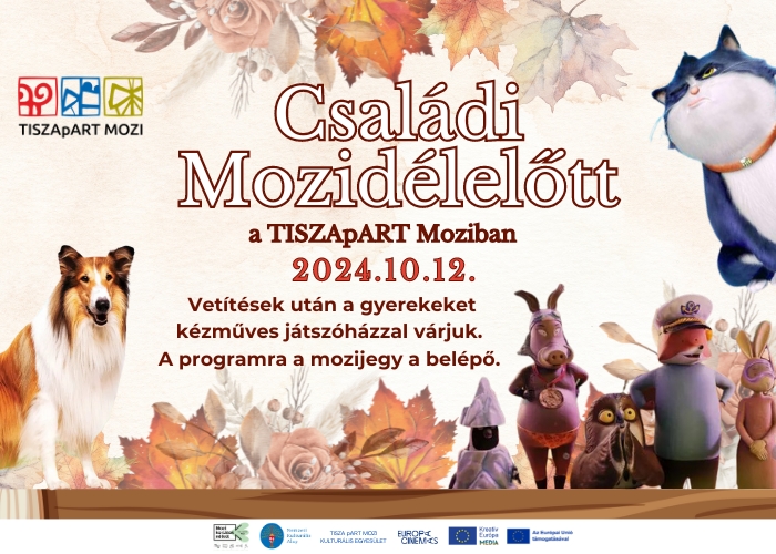 Családi mozidélelőtt október 12-én:10:30 Egy cica 10 élete (6) - magyarul beszélő, angol-kanadai animációs film, 88’ Egy elkényeztetett macska magától értetődőnek veszi gondtalan életét, amit Rose-nak köszönhet, a melegszívű és lelkiismeretes egyetemista lánynak. Amikor a jószág elveszíti kilencedik életét, az égi gondviselés ad neki még egy esélyt, s ezzel egy minden porcikáját megváltoztató kaland veszi kezdetét.PREMIER ELŐTT:10:45 Rókus és Rézi megmenti az erdőt (0) - magyarul beszélő, holland-belga-luxemburgi animációs film, 71’ A népszerű mesehősök, Rókus, Rézi és a barátaik boldog mindennapjaikat élik az erdőben, amíg Bagoly váratlanul el nem tűnik. A keresésére indulva nem sejtik, hogy hamarosan nemcsak őt, de az egész erdőt is meg kell menteniük. A film játékosan és kedvesen mesél a barátság és a természetvédelem fontosságáról. A világhírű tévésorozat főszereplői most mozifilmben nyújtanak önfeledt kikapcsolódást az egész családnak, életkortól függetlenül. AKADÁLYMENTESÍTETT VETÍTÉS látás- és hallássérültek számára is, kedvezményes 1200 Ft-os jegyáron:11:00 Lassie - Állati mentőakció (6) - Magyarul beszélő, német családi kalandfilm, 91’ Lassie kalandja folytatódik. Flo imádott kutyájával, Lassie-vel nagynénjénél nyaral Dél-Tirolban. A felhőtlen nyaralást beárnyékolja Pippa, a kis terrier eltűnése, akit vélhetően elraboltak. Flo és Lassie azonnal a kis négylábú keresésére indul. Hamarosan kiderül, hogy nem Pippa az egyetlen kutyus, aki rejtélyes körülmények között tűnt el. Lassie és barátai nyomozni kezdenek és kiderül, az ügy sokkal nagyobb titkokat rejt, mint gondolták.A vetítések után a Gyerekeket kézműveskedéssel várjuk!A programra a mozijegy a belépő.