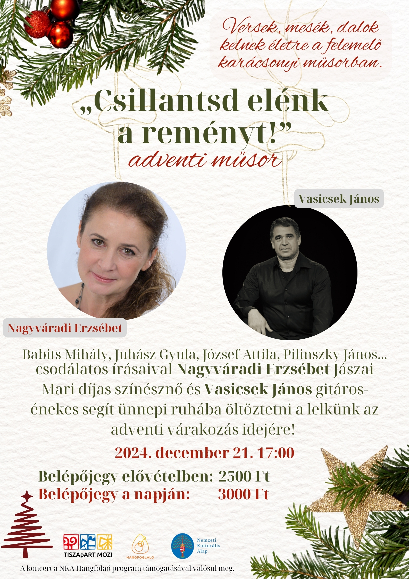 "Csillantsd elénk a reményt!" adventi műsorNagyváradi Erzsébet Jászai Mari-díjas színésznő és Vasicsek János gitáros-énekes előadásaMegható, lélekemelő műsor az ádventi ünnepre, a várakozás idejére! Az előadás hossza 1 óra. Jézus születésére Lukács evangéliumának segítségével emlékezünk, majd a legnagyobb magyar írók és költők: Babits Mihály, Juhász Gyula, Móra Ferenc, Fekete István, Szabó Lőrinc, stb... tollából versek, mesék kelnek életre a Jászai Mari-díjas Nagyváradi Erzsébet érzelemdús tolmácsolásában. A versek, novellák között közismert dalok és megzenésített versek előadásával idézi meg a karácsonyi hangulatot Vasicsek János gitáros-énekes. A szívmelengető műsor ünnepi ruhába öltözti lelkünket a Megváltó eljövetelére.Jegyár elővételben: 2500 Ft, az esemény napján 3000 Ft.A program a NKA Hangfoglaló program támogatásával valósul meg.A szervezők a műsorváltozás jogát fenntartják.