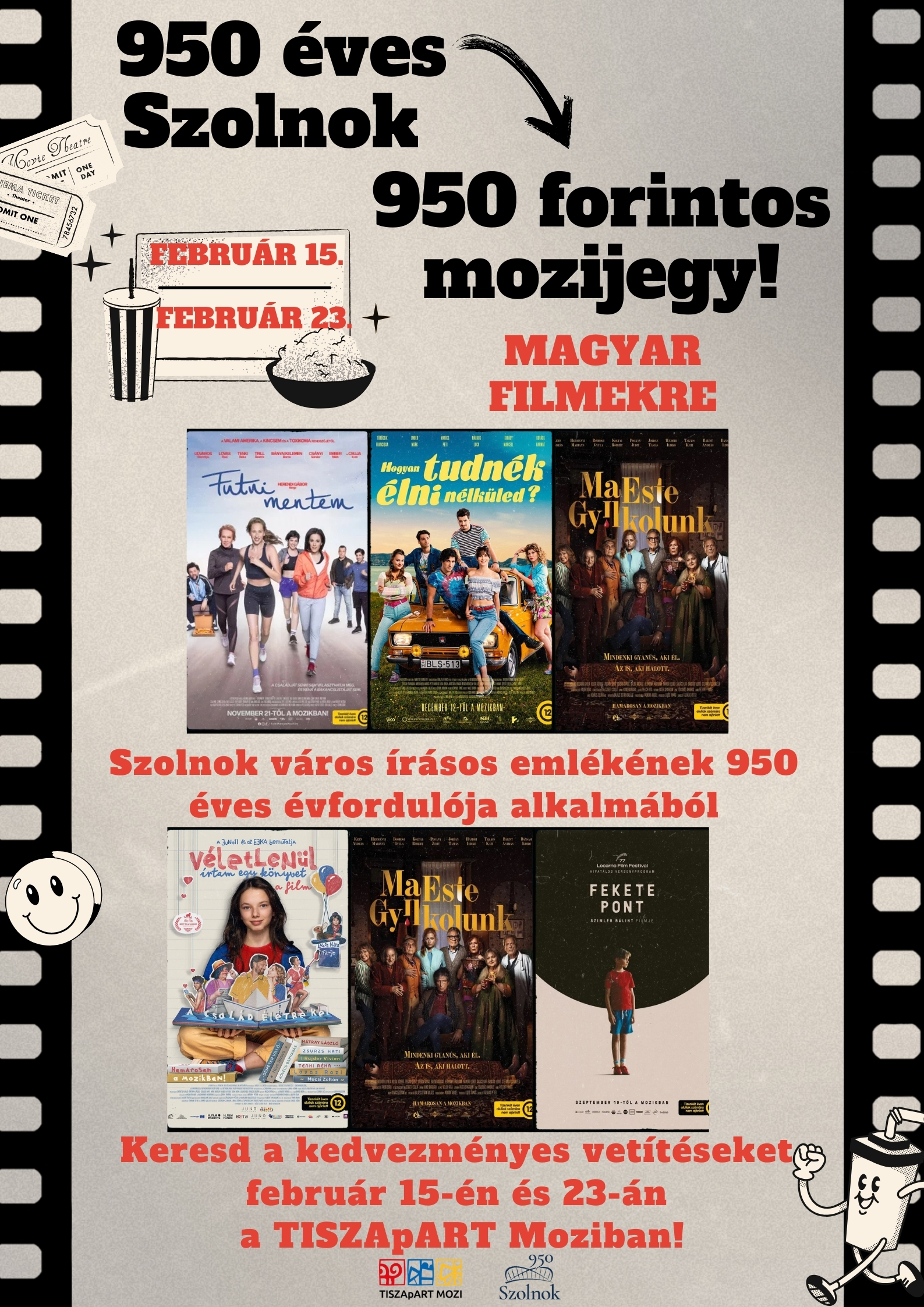 950 éves Szolnok – 950 forintos mozijegy!Szolnok idén ünnepli első írásos említésének 950. évfordulóját – és mi egy különleges filmes ajándékkal készülünk!2025. február 15-én (szombaton) és február 23-án (vasárnap) a TISZApART Moziban magyar filmeket nézhetsz csupán 950 forintért! Ne hagyd ki ezt a jubileumi filmélményt! Keresd a kedvezményes vetítéseket, és mozijeggyel a kezedben ünnepeld Szolnok történelmét! Kedvezményes vetítések:Február 15, szombat 9:30 Futni mentem (12)9:45 Hogyan tudnék élni nélküled? (12)10:00 Ma este gyilkolunk (12)11:30 Fekete pont (12)11:45 És mi van Tomival? (16)12:30 Véletlenül írtam egy könyvet (12)Február 23, vasárnap10:00 Fekete pont (12)10:15 És mi van Tomival? (16)10:30 Véletlenül írtam egy könyvet (12)13:45 Hogyan tudnék élni nélküled? (12)16:15 Futni mentem (12)