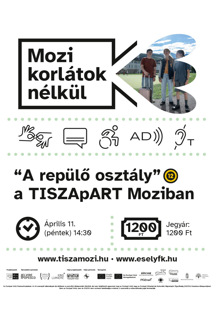 Mozi korlátok nélkül kedvezményesen a TISZApART Moziban, Szolnokon!Április 11-én pénteken 14:30 órától A repülő osztály című német családi vígjátékot (89 perc, 2023) láthatják jelnyelvi tolmácsolással, felirattal és audionarrációval akadálymentesítve. Kedvezményes jegyár: 1200 Ft, bérlet 6 alkalomra: 6000 Ft/fő, csoportos jegy: 6000 Ft/6 fő!Szeretettel várjuk Önöket! A film összefoglalója:A repülő osztály (német családi vígjáték 89 perc, 2023) korhatár: 12A tehetséges Martina 13 éves, Berlinben él egy lakótelepen és napról-napra rengeteg nehézséggel kell megbirkóznia. Egy nap a tini megkapja élete lehetőségét: ösztöndíjat nyer egy festői alpesi településen található, rangos bentlakásos iskolába. Az új gimnázium új esélyt jelent a lány számára, aki csak tanulni szeretne és elkerülni a bajt. A tini azonban hamarosan itt is a középiskolai rivalizálás középpontjában találja magát.Magyarországon is hatalmas népszerűségnek örvendenek Erich Kästner ifjúsági regényei. Generációk nőttek fel A két Lotti, az Emil és a detektívek és A repülő osztály történetein. Utóbbi legújabb filmfeldolgozását az alkotók kortárs közegbe helyezték és a ma fiataljainak az igényeihez igazították. A főszerepet a fiatal színészek mellett Tom Schilling játssza, aki napjaink egyik legnépszerűbb német színésze (Mű szerző nélkül, Napola – A Führer elit csapata, Fabian: A vég kezdete, Who Am I: Egy rendszer sincs biztonságban).