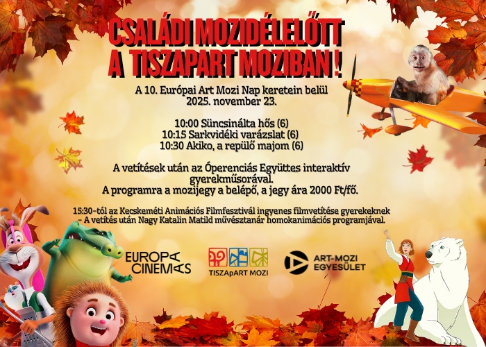 Vetítések:10:00 Süncsinálta hős (6)10:15 Sarkvidéki varázslat (6) 10:30 Akiko, a repülő majom (6)A vetítések után az Óperenciás Együttes interaktív gyerekműsorával várunk minden érdeklődőt.A programra a mozijegy a belépő, a jegy ára 2000 Ft/fő. Délután egy különleges animációs programot tartunk 8–18 éves korosztálynak. A Kecskeméti Animációs Filmfesztivál díjnyertes filmjeit vetítjük 15:30-tól, ezután Nagy Katalin Matild animációs művész közös homokanimációt készít a közönséggel. A programról élő Facebook-közvetítéseket is tervezünk.