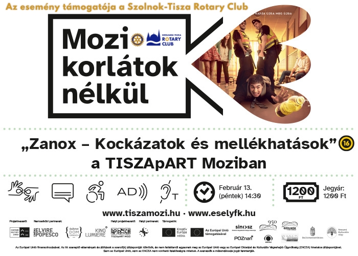 Mozi Korlátok Nélkül kedvezményesen a TISZApART Moziban, Szolnokon!Február 13-án, pénteken 14:30-tól a Zanox – Kockázatok és mellékhatások című, magyar romantikus vígjátékot láthatják jelnyelvi tolmácsolással, felirattal és audionarrációval akadálymentesítve.Kedvezményes jegyár: 1200 FtÖsszefoglaló:A kétes eredetű házi pálinkák sok fejfájást okoznak, a Zanox nevű kísérleti szerrel viszont lehetővé teszik az időutazást. Ráadásul más piákkal ellentétben nem előre, hanem a múltba. Misivel is ez történik, akit a következő reggelen a másnaposság helyett ismét az érettségi vár. A szokatlan helyzettel élve Misi bátrabban kezdeményez Jankánál, akibe régóta szerelmes, megpróbál megakadályozni egy gyilkosságot, és a töri tételt is átnézi, amit húzni fog. Arra viszont nem gondol, hogy mennyi mindennek kell a helyén lennie ahhoz, hogy napját valóban a legjobbá alakítsa, miközben vészesen fogy az időutazás üzemanyaga, a házi pálinka. Baranyi Benő első nagyjátékfilmje romantikus és sci-fi jegyekkel átszőtt vígjáték.Szeretettel várjuk Önöket!
