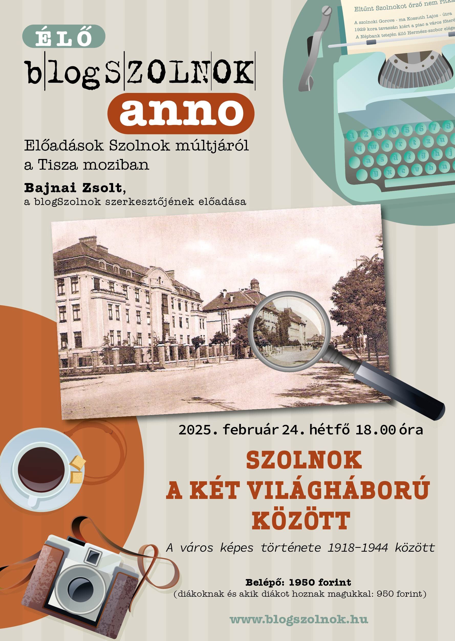A város képes története 1918-1944 között A Tisza szálló, a Verseghy park, az evangélikus templom, a tárház, a Szapáry utcai Hitelbank épülete, de a MÁV uszoda és számtalan bérház is abban a szűk negyedszázadban épült Szolnokon, aminek határait akár az első vasbeton közúti híd, a „szép Tisza-híd” felrobbantásai is kijelölhetnék. Az ország tizedik legnagyobb városává vált Szolnok lakossága a korszak elején éppúgy kicserélődött, mint az azt lezáró vészterhes hónapokban. Fotók, képeslapok, térképek, újságcikkek és kereskedelmi számlák mesélnek erről a negyedszázadról mindazoknak, akik először vagy ismét meghallgatják ezt az előadást. Bajnai Zsolt, a blogSzolnok szerkesztőjének vetített előadása a Tisza mozi E termében
