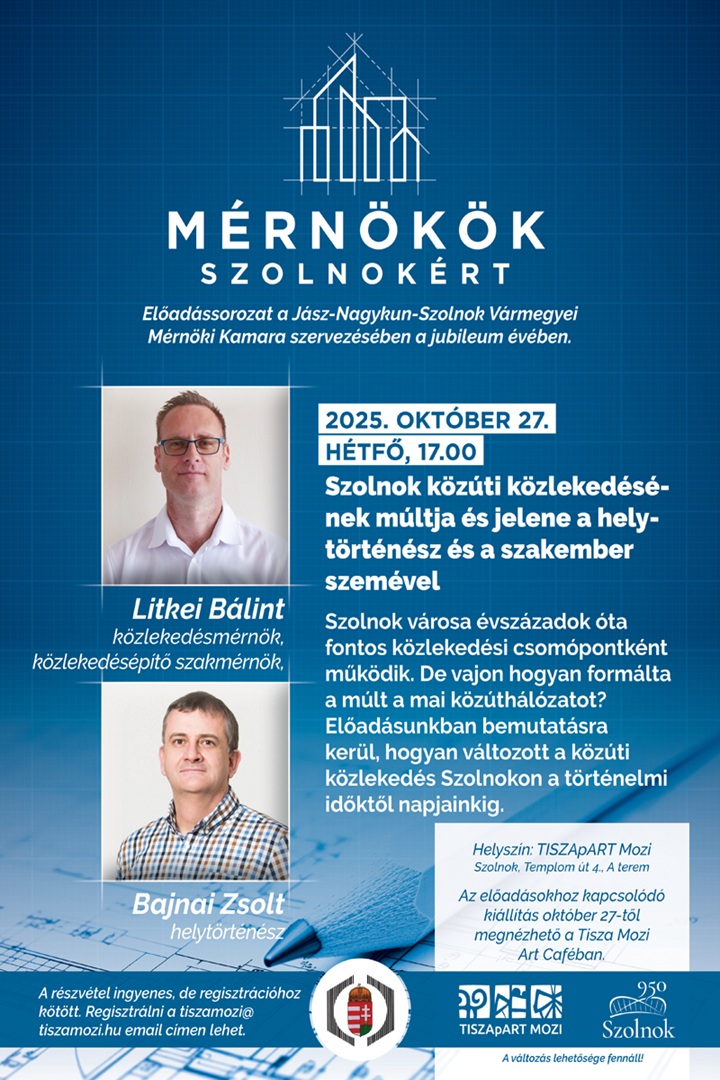 Mérnökök Szolnokért előadássorozat a Jász- Nagykun-Szolnok Vármegyei Mérnöki Kamara szervezésében a jubileum évében. Szolnok közúti közlekedésének múltja és jelene a helytörténész és a szakember szemével Szolnok városa évszázadok óta fontos közlekedési csomópontként működik. De vajon hogyan formálta a múlt a mai közúthálózatot? Előadásunkban bemutatásra kerül, hogyan változott a közúti közlekedés Szolnokon a történelmi időktől napjainkig. Előadók: Bajnai Zsolt, Litkei Bálint Az előadásokhoz kapcsolódó kiállítás október 27-től megnézhető a Tisza Mozi Art Caféban.